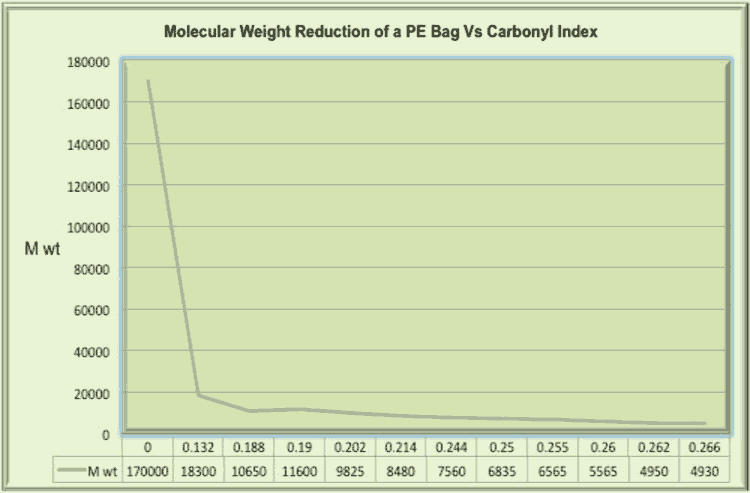 The more carbonyls introduced the further removed it becomes from its polymeric nature. Once a critical point has been achieved in carbonyl index the polymer loses its flexibility and breaks apart under the minutest of stresses. At this time it is considered to be at its ‘embrittlement point’.
