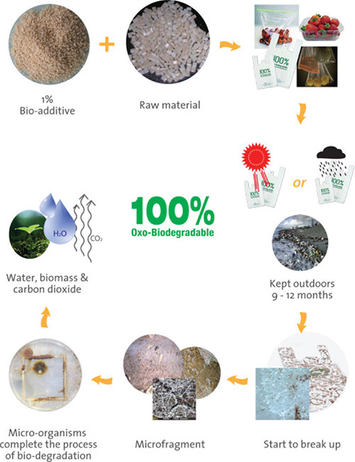 The term ‘Oxobiodegradability’ is a hybridisation of two words, oxidation and biodegradability. It defines clearly a two step process initiated in this case by the Reverte® additive to degrade the polymer chain (break up) and make it available for biodegradability within the environment when a treated item has finished its useful life.